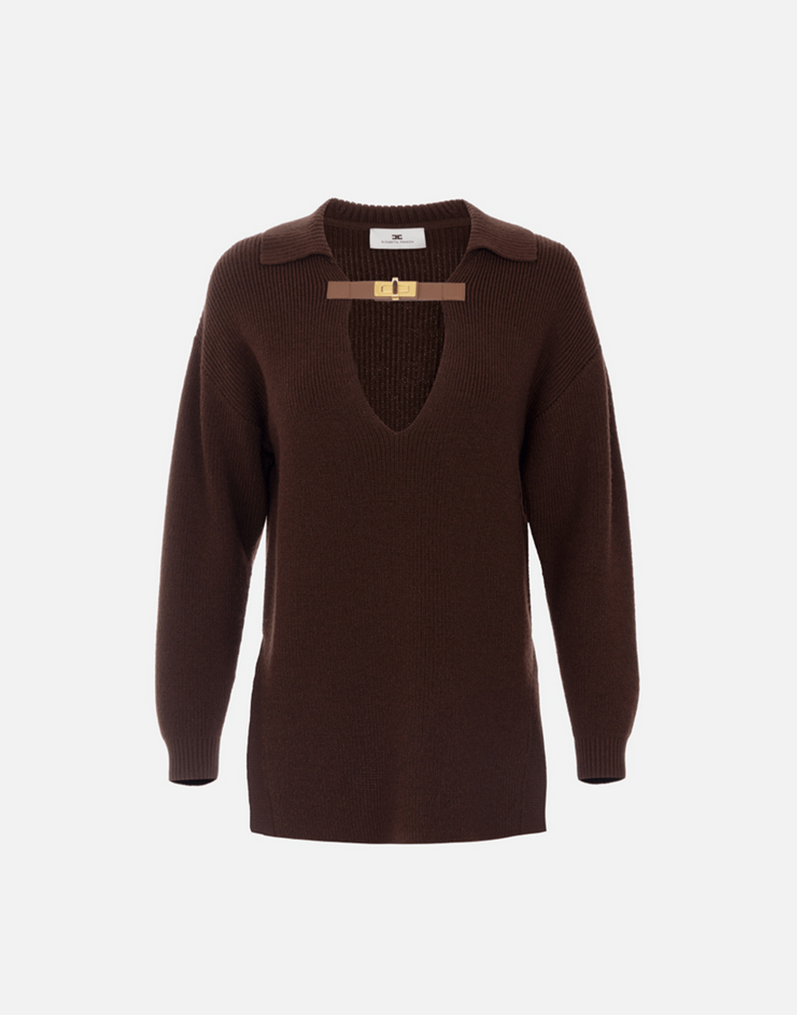 ELISABETTA FRANCHI Maglia in misto lana con cinturino gioiello colore COFFEE
