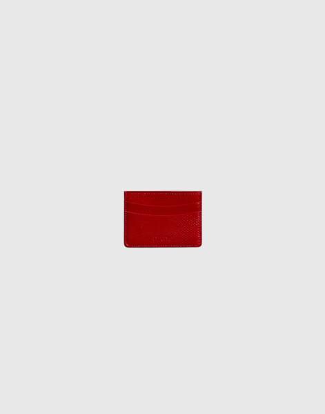 Portacarte in pelle rossa con texture a grana sottile, caratterizzato da un design compatto ed elegante.