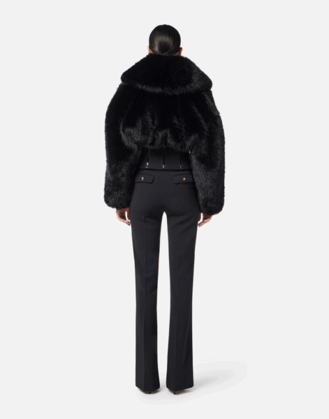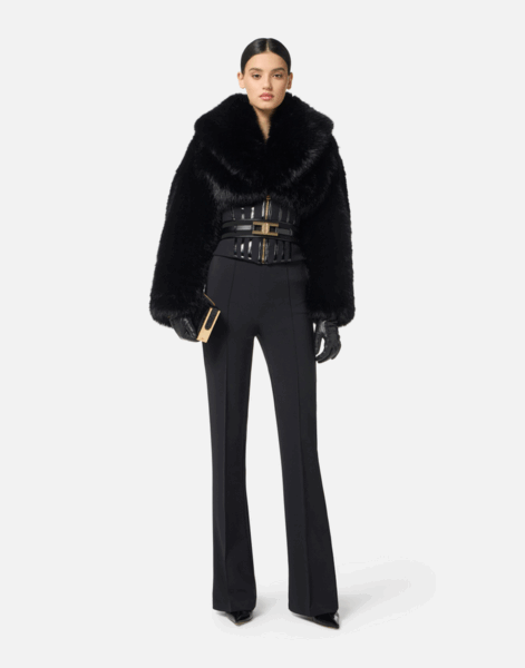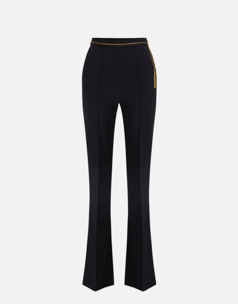 Pantaloni in crêpe leggero dalla vestibilità aderente e con gamba leggermente svasata alla caviglia. Si distinguono per la cintura che impreziosisce il punto vita, realizzata in catena con logo e nappina pendente. Sul retro, patte applicate con bottoni smaltati e pattern di ispirazione snake.