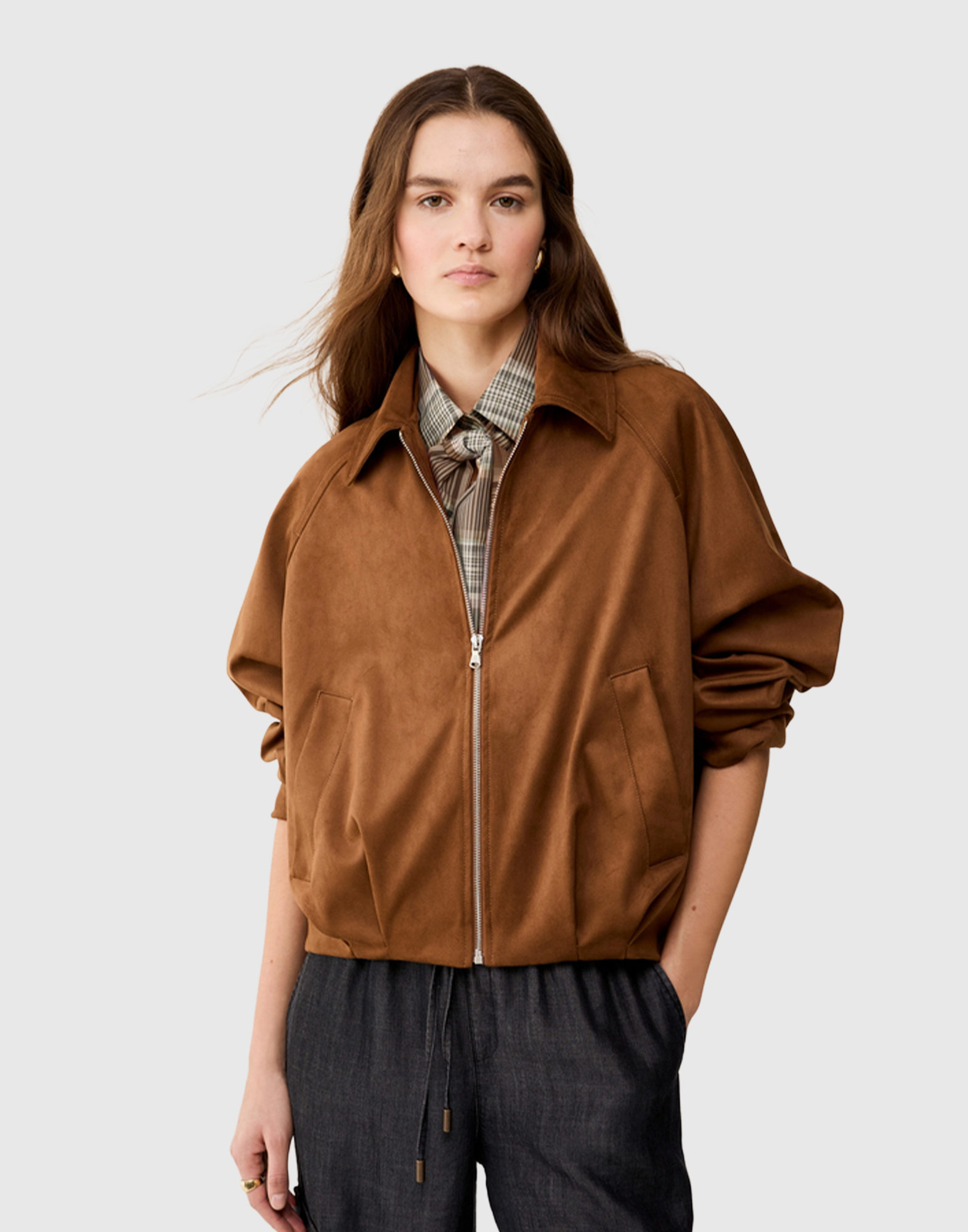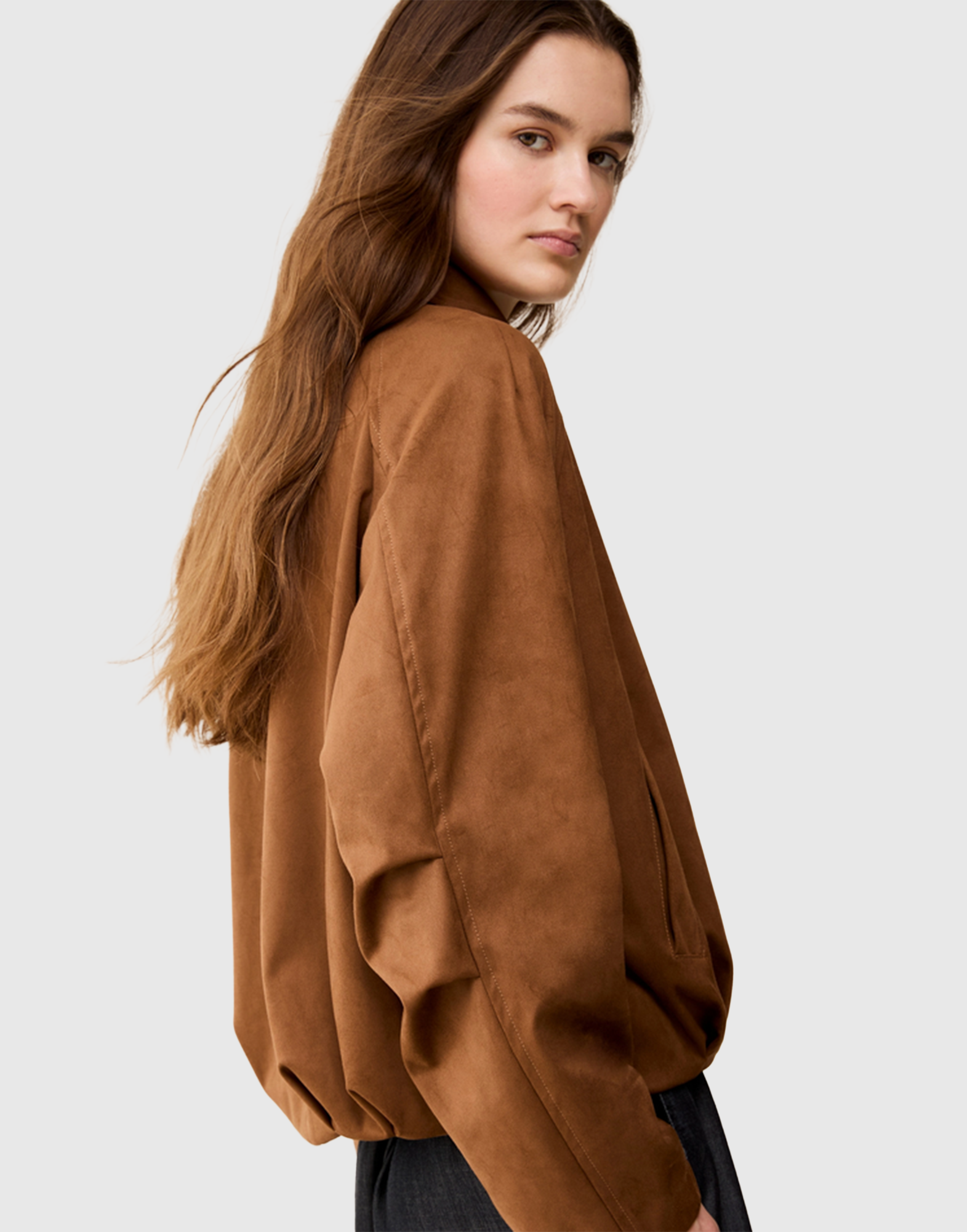 Icona streetwear, il bomber addolcisce il suo carattere grintoso in questa versione: in jersey vellutato, ha volumi mossi da pieghe morbide che ne rinnovano la silhouette.