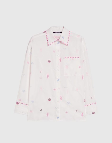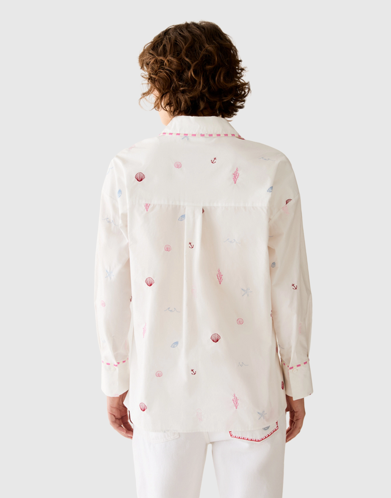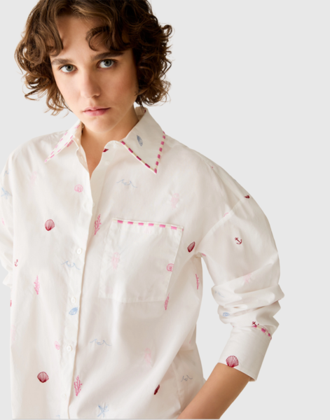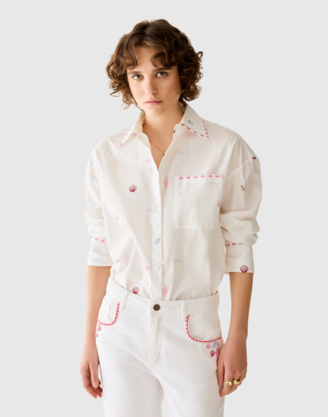 La camicia dal taglio classico d’ispirazione maschile esce dal guardaroba da città ed è pronta a partire per le vacanze. Arricchita da ricami a tema marino, fa parte della capsule I Wish You Were With Me, realizzata in collaborazione con il brand britannico di homeware Amuse la Bouche.