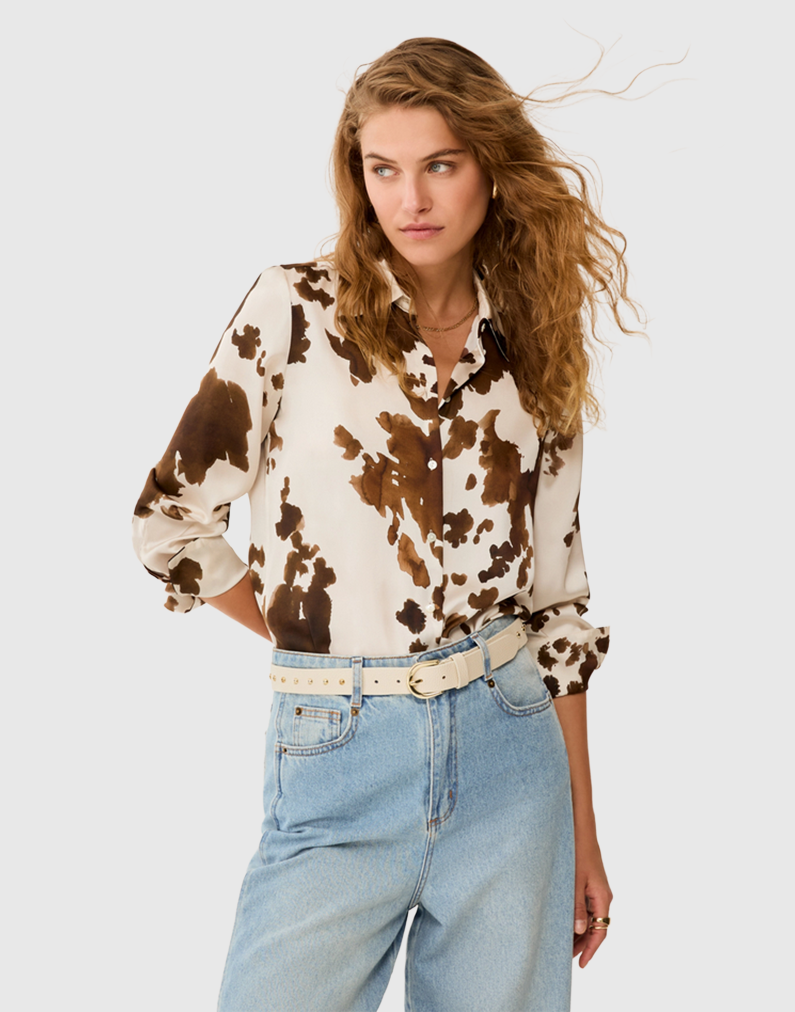 Fluida e lucente, questa camicia dal design classico punta sulla fantasia: da scegliere a pois per aggiungere un tocco frizzante all’outfit o a stampa cow per un look country chic.