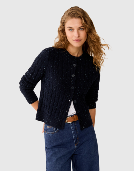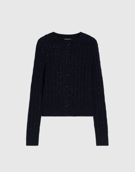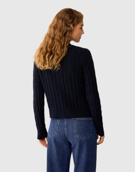 Nuova rivisitazione per il classico cardigan a trecce: con proporzioni che sfiorano il corpo, è arricchito da piccoli strass che cattureranno ogni raggio di sole.