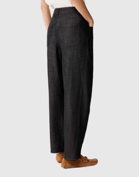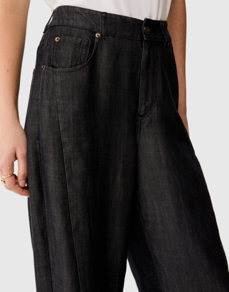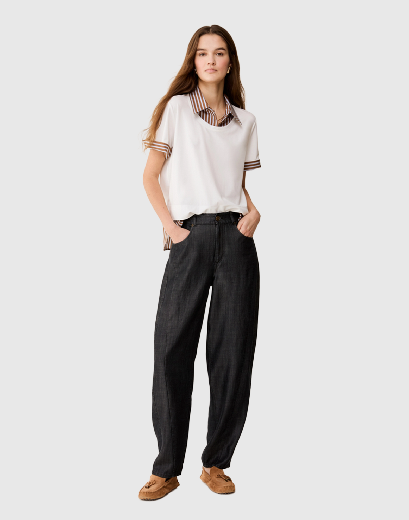 Variazione urban chic sul tema dei jeans classici, questa versione dall’attitudine rilassata declina un denim fluido blue black su una moderna silhouette barrel leg definita da bande laterali decentrate.