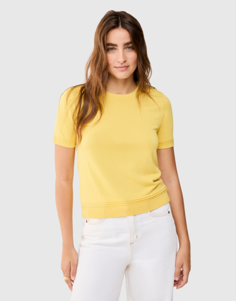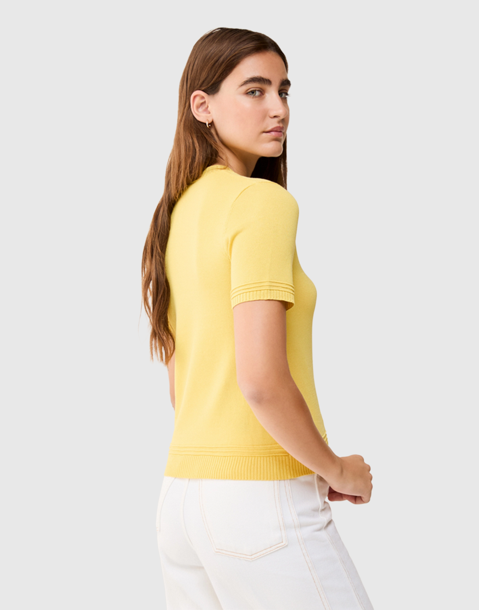 La versione chic della classica T-shirt è in maglia leggera, accuratamente rifinita nei dettagli, e sfiora la silhouette con un morbido blend di cotone, viscosa e seta.