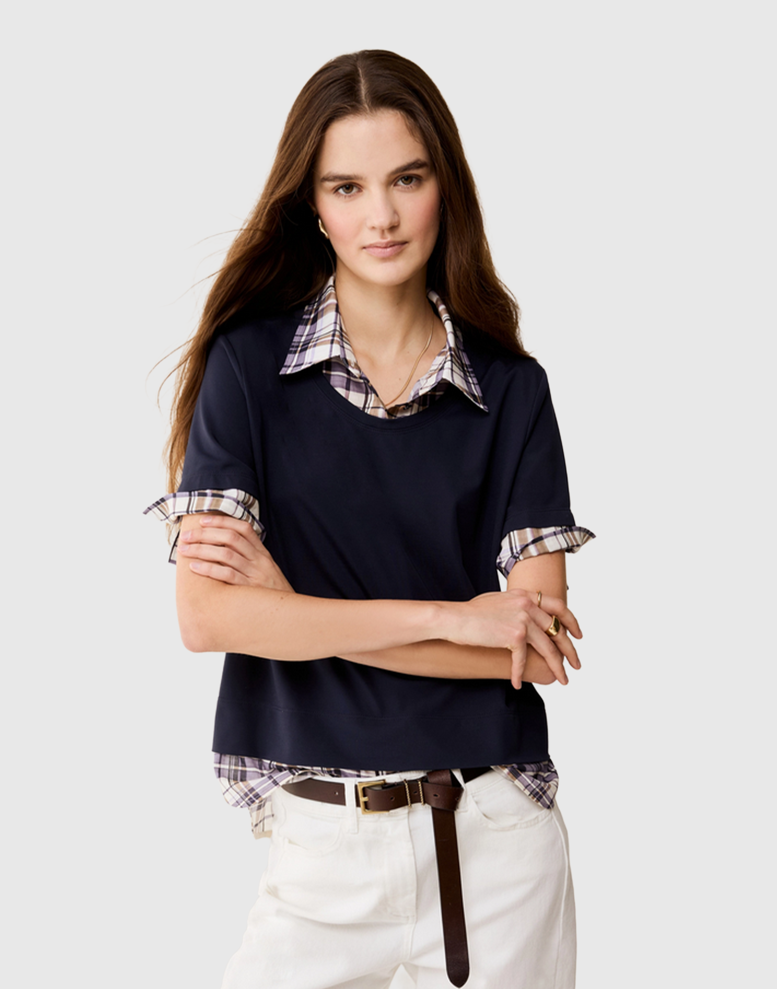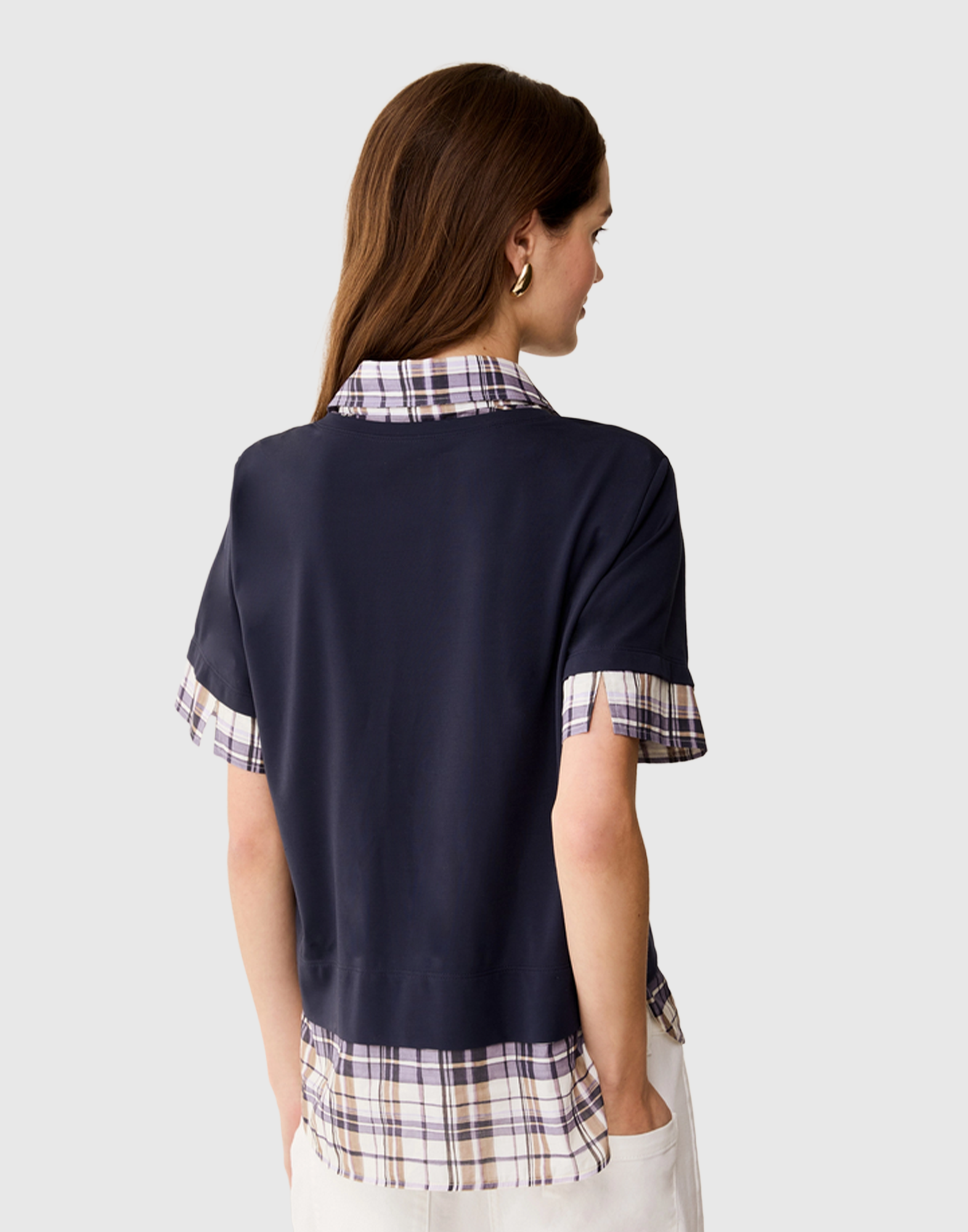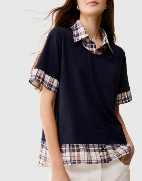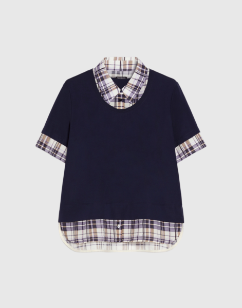Realizzato in jersey e rifinito in voile di cotone, questo capo crea l’effetto di una T-shirt sovrapposta a una camicia a scacchi: soluzione veloce per un outfit perfetto.