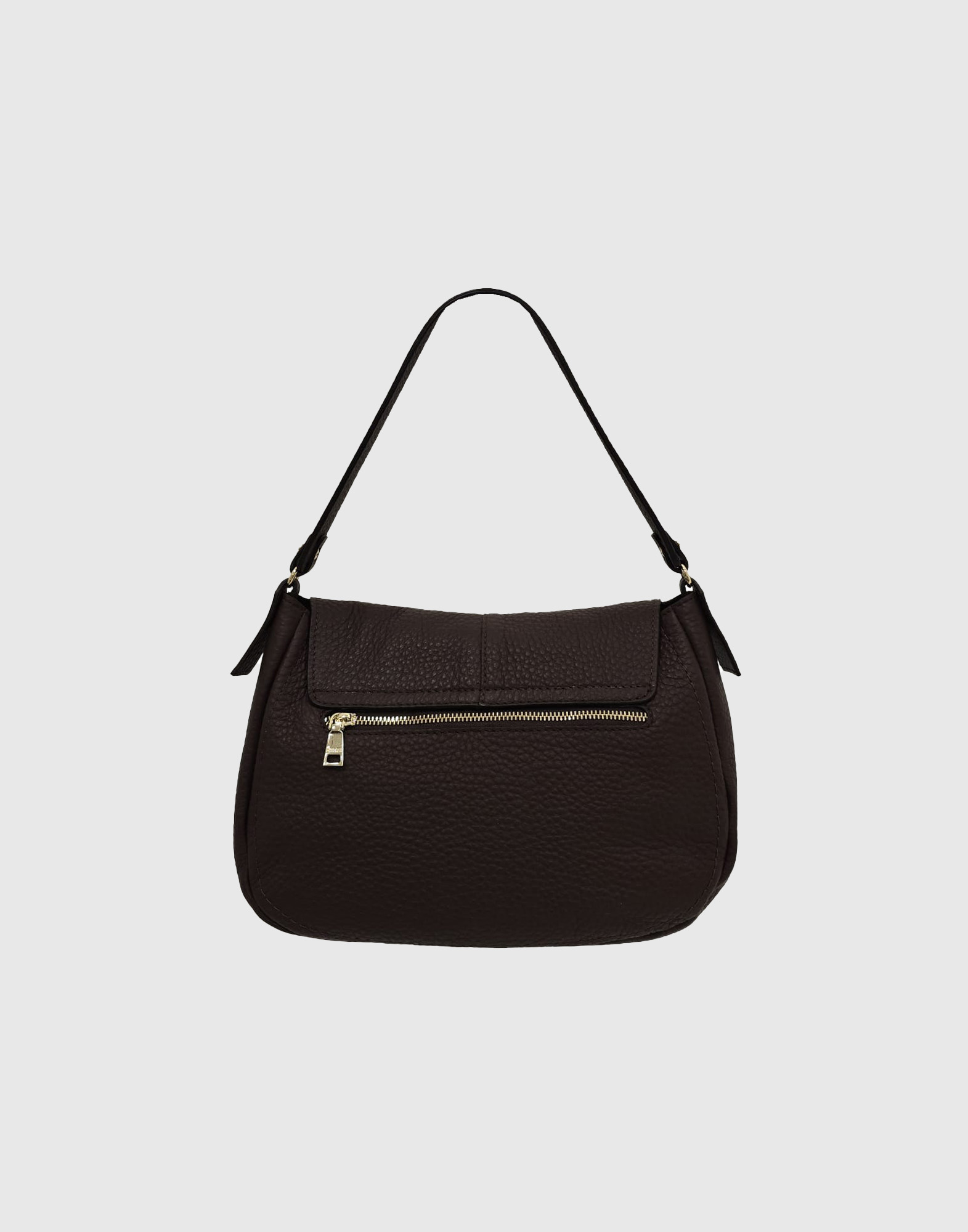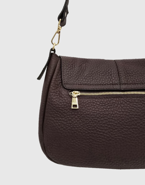 Borsa a spalla con patta e tracolla regolabile, chiusura zip e magnete, taschino interno con zip, tasca portacellulare, vera pelle effetto bufalo, accessori oro chiaro