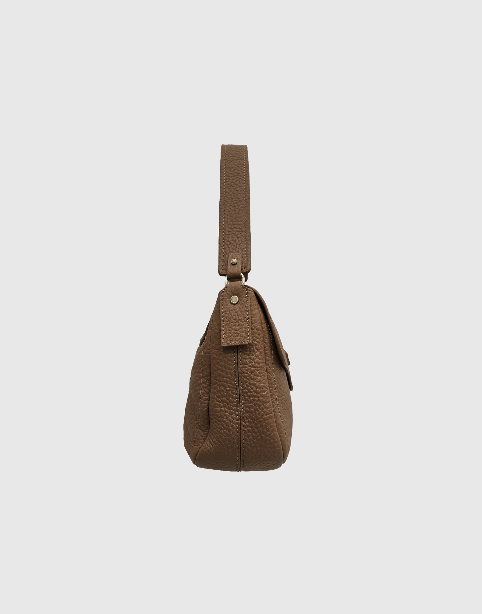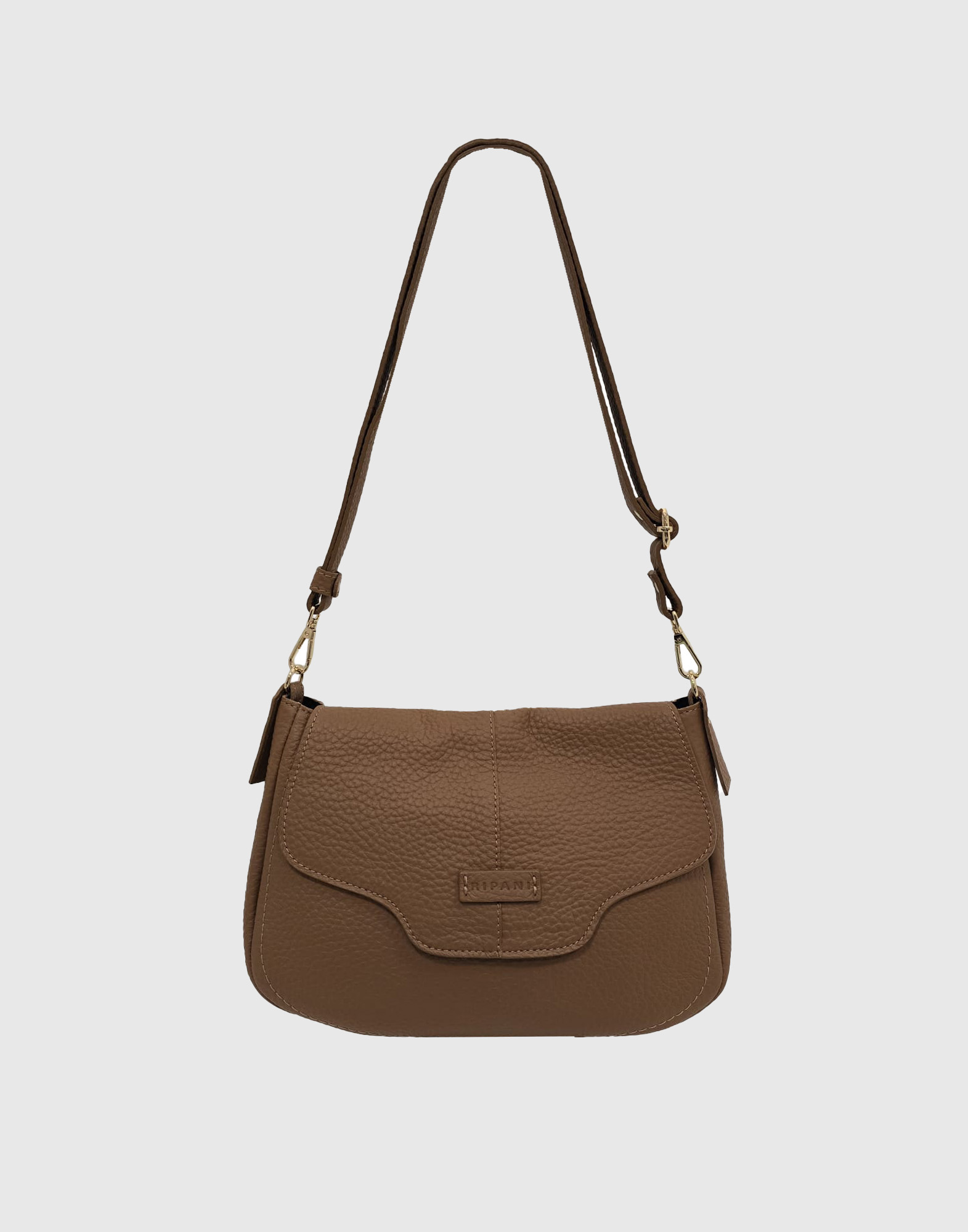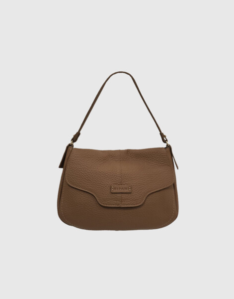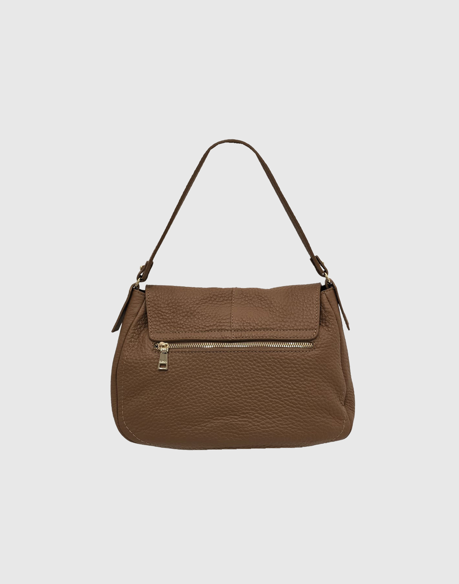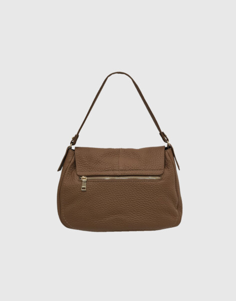 Borsa a spalla con patta e tracolla regolabile, chiusura zip e magnete, taschino interno con zip, tasca portacellulare, vera pelle effetto bufalo, accessori oro chiaro