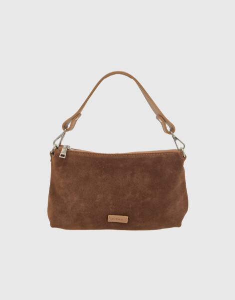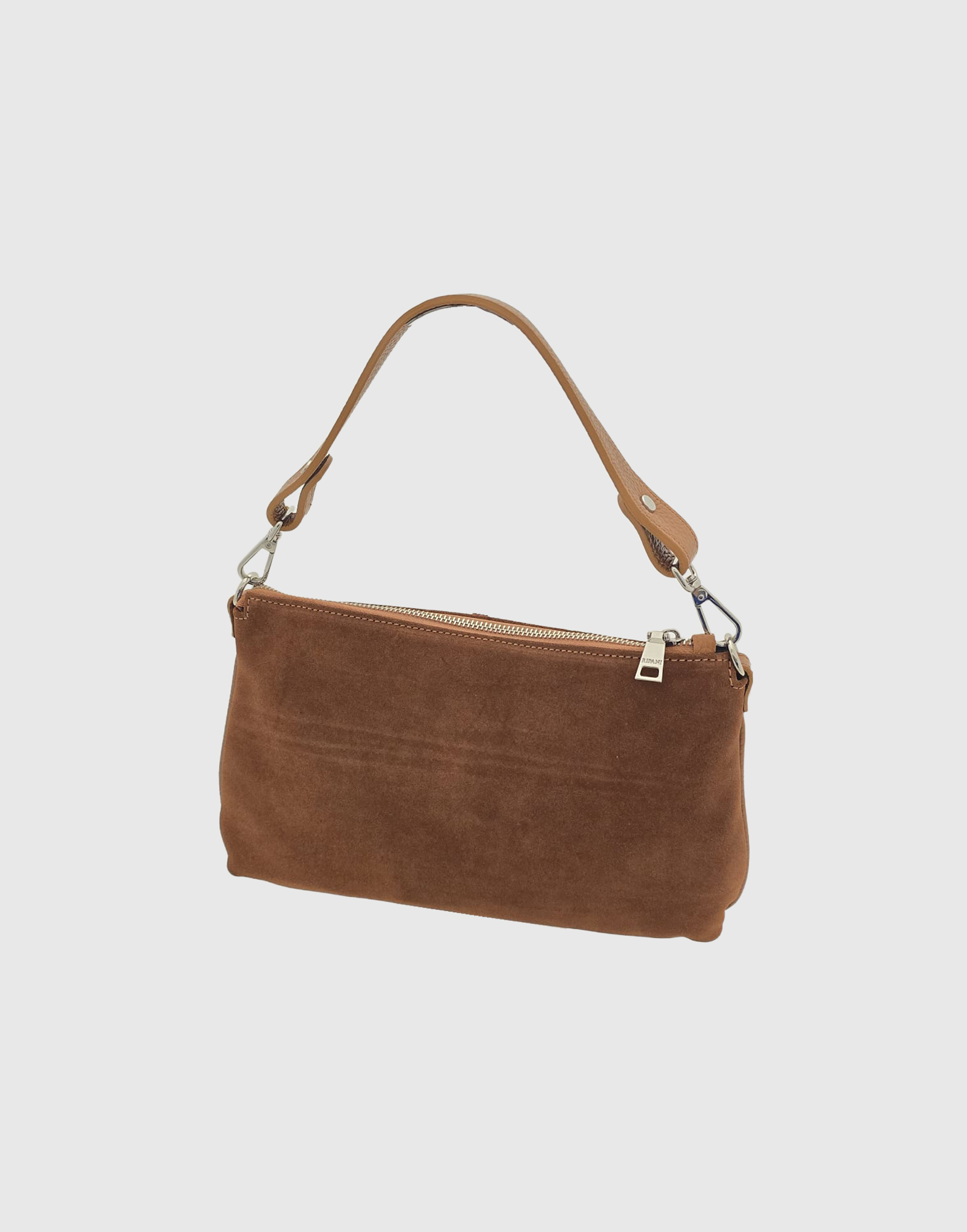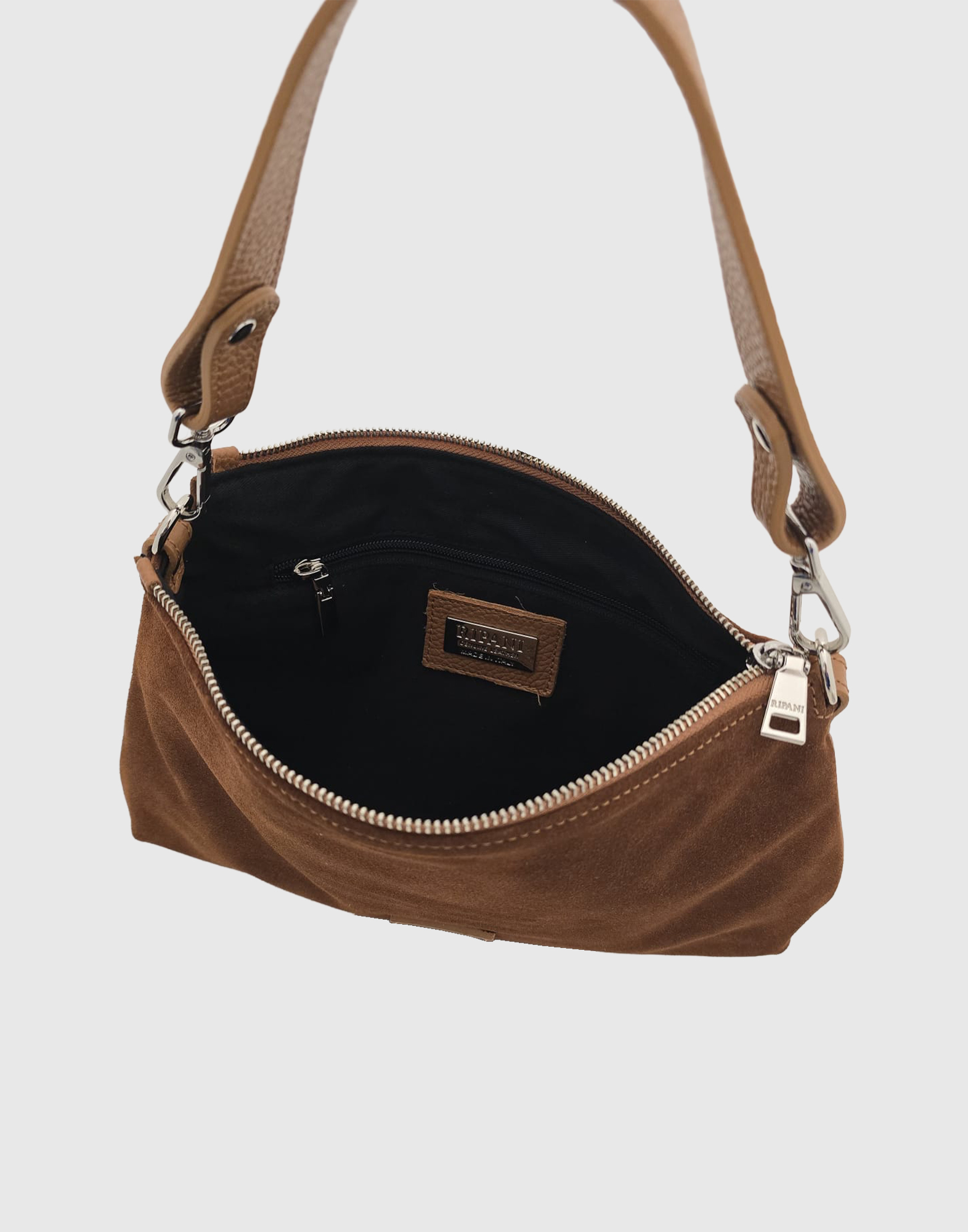 Borsa a spalla con tracolla regolabile, chiusura zip, taschino interno con zip, tasca portacellulare, vera pelle scamosciata, accessori nichel